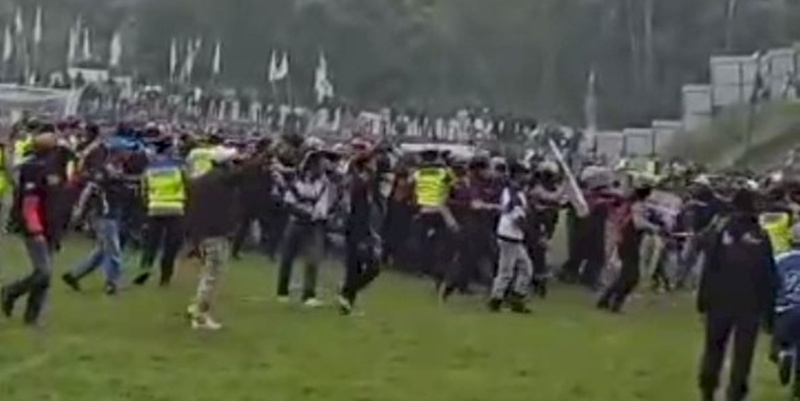 Tiga anggota kepolisian mengalami luka ringan setelah dilempari benda keras oleh penonton yang kecewa terhadap keputusan wasit.
