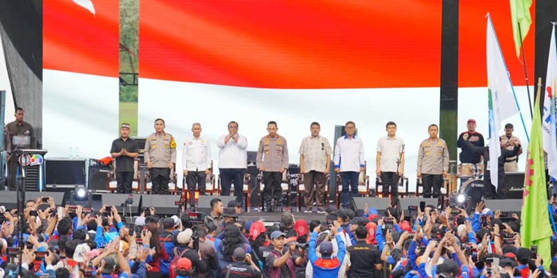 Kapolri Jenderal Listyo Sigit Prabowo bersama pimpinan Konfederasi Serikat Pekerja Seluruh Indonesia (KSPSI) menghadiri acara Apel Akbar Kebangsaan Buruh Indonesia di Lapangan Botanical Jababeka, Bekasi pada Rabu, 15 Oktober 2025. Dalam acara itu elemen buruh dan Polri bersinergi untuk menjaga stabilitas kamtibmas. (Foto: Humas Polri)
