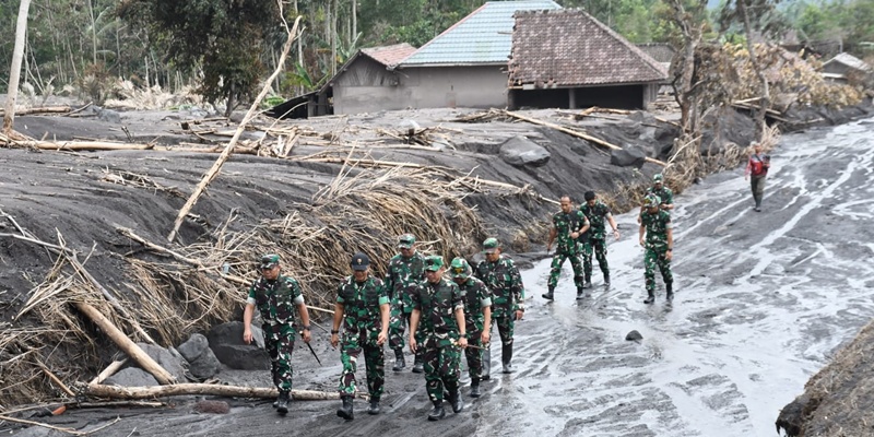 Kasdam V/Brawijaya Brigjen TNI Zainul Bahar bersama Danrem 083/Baladhika Jaya Kolonel Inf Kohir melaksanakan peninjauan langsung ke wilayah terdampak erupsi Gunung Semeru di Desa Supiturang, Kecamatan Pronojiwo, Kabupaten Lumajang, Sabtu, 22 November 2025. Dalam peninjauan tersebut, Kasdam melihat dari dekat kondisi permukiman, akses jalan terdampak material vulkanik, serta mengecek titik-titik prioritas yang membutuhkan percepatan penanganan. (Foto: Puspen TNI)
