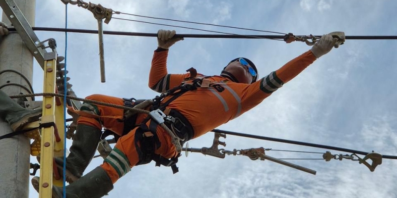 Seorang petugas PT PLN (Persero) bergelantungan untuk melakukan penarikan kabel Saluran Udara Tegangan Menengah (SUTM) di Panton Labu, Aceh Utara, Provinsi Aceh. PLN memastikan sistem kelistrikan di Provinsi Aceh telah pulih sepenuhnya pascabencana. Pemulihan ini ditandai dengan beroperasinya kembali 20 Gardu Induk (GI) yang ada di Aceh, sehingga sistem kelistrikan utama kembali normal.(Foto: PT PLN (Persero))