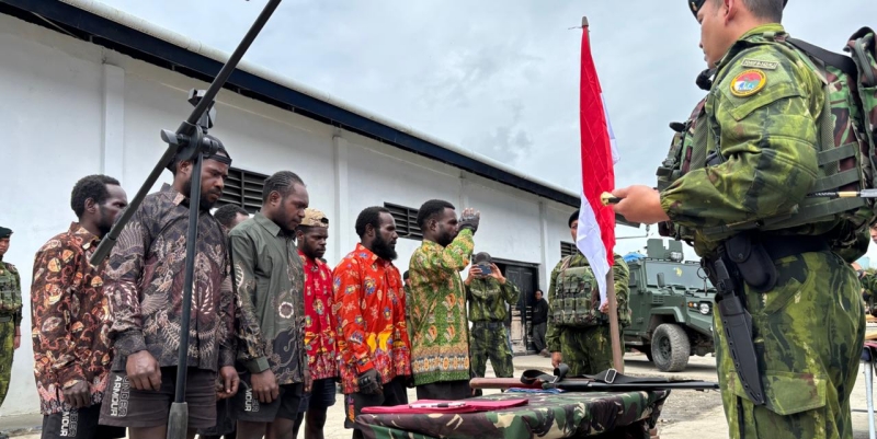 Tujuh mantan anggota TPNPB Organisasi Papua Merdeka (OPM) yang pernah terlibat pembakaran SMA Distrik Sinak dan penyanderaan pegawai Puskesmas Sinak Barat pada tahun 2024, secara resmi menyatakan Ikrar Setia kepada NKRI dalam Acara Ikrar NKRI yang dilaksanakan di Pos Sinak BNPB Satgas Yonif 142/KJ, Kabupaten Puncak, Provinsi Papua Tengah, Sabtu 20 Desember 2025. Prosesi Ikrar Setia ini disaksikan langsung oleh aparat keamanan (Apkam) dan para tokoh masyarakat di Distrik Sinak.(Foto: Puspen TNI)