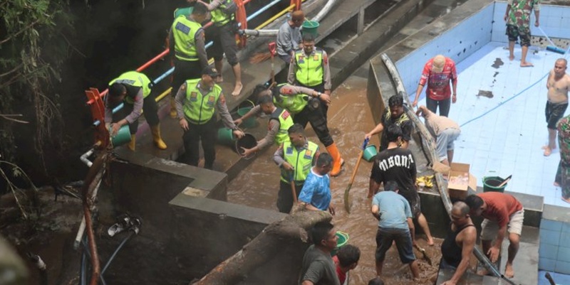 Usai terjadinya luapan air sungai akibat intensitas hujan tinggi, Tim Siaga Bhayangkara Polres Tegal, unsur TNI, pemerintah daerah, pengelola objek wisata, serta masyarakat sekitar melaksanakan kegiatan gotong royong pembersihan di kawasan wisata Guci, Kabupaten Tegal.