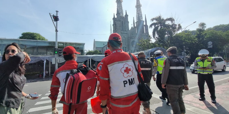 Petugas Palang Merah Indonesia (PMI) berjumlah 3 orang membawa yang peralatan medis, tengah menyebrang ke arah Gereja Katedral Santa Perawan Maria, di protokol Jalan Katedral, Ps. Baru, Sawah Besar, Jakarta Pusat, Kamis pagi, 25 Desember 2025. Di pagi yang cerah ini, para petugas PMI itu akan menjalankan tugasnya sebagai tenaga medis yang disiagakan membantu Jemaat Katolik yang menjalankan ibadah Natal 2025 di Katedral. (Foto: RMOL/Ahmad Satryo)