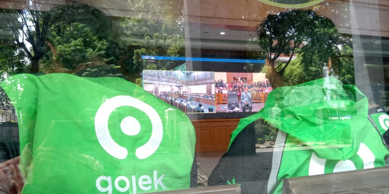 Sejumlah pengemudi Gojek terpaksa mengikuti persidangan mantan Menteri Pendidikan Kebudayaan Riset dan Teknologi (Mendikbudristek) Nadiem Makarim melalui layar videotron di area lobi Pengadilan Tindak Pidana Korupsi, Jakarta Pusat pada Senin, 5 Januari 2026. Kehadiran mereka untuk memberi dukungan kepada pendiri Gojek itu yang akan menjalani persidangan dengan agenda pembacaan dakwaan. Nadiem disebut terlibat dalam kasus dugaan korupsi Program Digitalisasi Pendidikan tahun 2019 sampai 2022. (Foto: RMOL/Ahmad Alfian)
