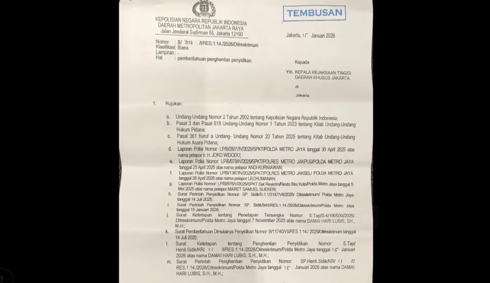 Polda Metro Jaya menerbitkan surat perintah penghentian penyidikan (SP3) dalam perkara dugaan pencemaran nama baik dan fitnah terkait ijazah mantan Presiden Joko Widodo (Jokowi) dengan tersangka Damai Hari Lubis. SP3 terbit tanggal 15 Januari 2026 atau sepekan setelah Damai dan tersangka kasus yang sama Eggi Sudjana sowan ke Jokowi di kediamannya di Solo, Jawa Tengah. (Foto: tangkapan layar YouTube tvOneNews)