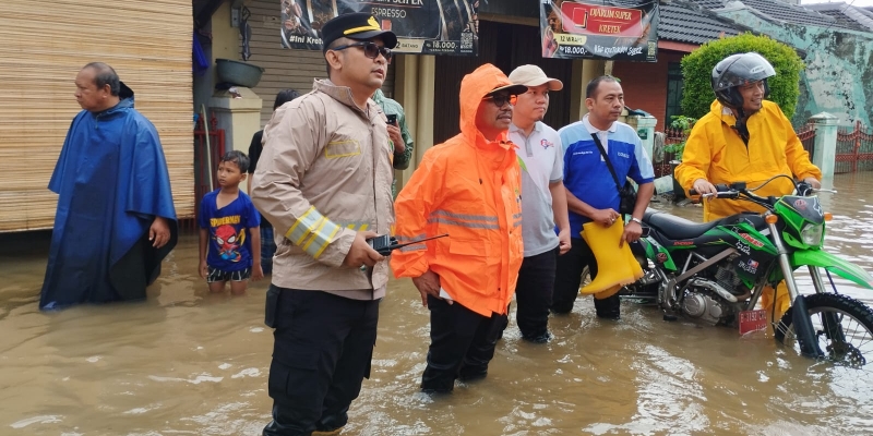 Walikota Tangerang Sachrudin dan Kapolsek Pinang Iptu Adityo Wijanarko meninjau Perumahan Pinang Griya, Kecamatan Pinang, Kota Tangerang yang terendam banjir. (Foto: Humas Polsek Pinang)