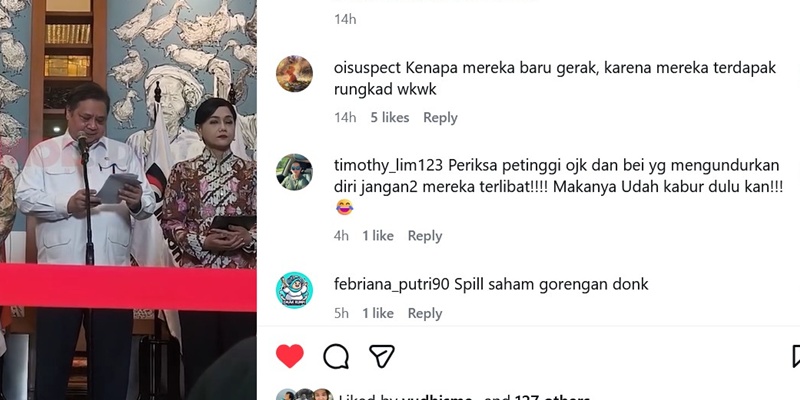 “Periksa petinggi ojk dan bei yg mengundurkan diri jangan2 mereka terlibat!!!! Makanya Udah kabur dulu kan!!” tulis akun @timothy_lim123 disertai emoticon menangis.