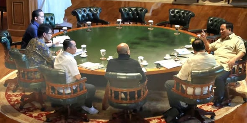 Presiden Prabowo Subianto tampak serius saat membahas perekonomian nasional bersama Menteri Koordinator Bidang Perekonomian Airlangga Hartarto, Menteri Keuangan Purbaya Yudhi Sadewa, Menteri Investasi dan Hilirisasi/Kepala BKPM sekaligus CEO Danantara Rosan Roeslani, serta Menteri Sekretaris Negara Prasetyo Hadi di Hambalang, Minggu, 15 Februari 2026. Salah satu masalah yang dibahas ialah terkait negosiasi tarif perdagangan dengan Amerika Serikat. (Foto: Setkab RI)