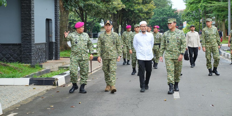 Ustaz Adi Hidayat bersama Panglima TNI Jenderal Agus Subiyanto didampingi Kepala Staf Angkatan Laut (KSAL) Laksamana TNI Muhammad Ali (kanan) dan Pangkormar Letjen TNI (Mar) Dr. Endi Supardi (kiri) berjalan memasuki Kesatrian Hartono Marinir, Cilandak, Jakarta Selatan, Kamis, 19 Februari 2026. Kegiatan Panglima TNI di Bumi Marinir Cilandak dalam rangka menyerahkan bantuan kepada ahli waris 23 prajurit Korps Marinir TNI AL yang gugur akibat tanah longsor saat latihan di Cisarua, Bandung Barat beberapa waktu lalu. (Foto: Puspen TNI)