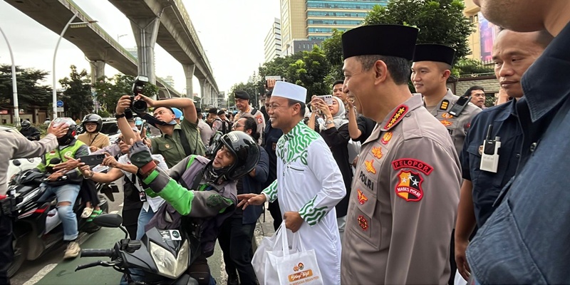 Sebelum kegiatan buka bersama insan pers, Kapolri bersama Pejabat Utama (PJU) mabes Polri mengadakan bagi takjil di sekitaran kawasan Mabes Polri, Jalan Trunojoyo, Jakarta Selatan.