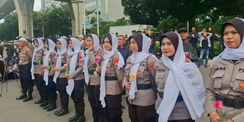Mereka berbaris depan gedung Mabes Polri mengelilingi mahasiswa yang berkumpul menyampaikan aspirasinya.