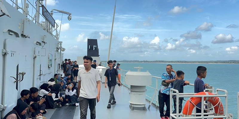 Ratusan pemudik terlihat senang mengikuti program mudik gratis yang diselenggarakan TNI Angkatan Laut menggunakan KRI Semarang-594 saat tiba di Dermaga Belinyu, Bangka, Senin, 16 Maret 2026. Kapal perang jenis Landing Platform Dock (LPD) tersebut sebelumnya bertolak dari Dermaga Kolinlamil, Jakarta Utara, membawa masyarakat yang hendak merayakan Hari Raya bersama keluarga di kampung halaman. (Foto: Dispenal)