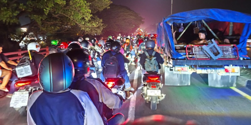 Kepadatan kendaraan mulai terlihat pada puncak arus mudik Lebaran 2026 di sepanjang ruas Jalan Pantura-Cikampek pada Kamis dini hari, 19 Maret 2026. Arus lalu lintas tampak padat merayap, terutama di sejumlah titik yang menjadi simpul pertemuan kendaraan dari arah Jakarta menuju Cirebon dan Jawa Tengah. (Foto: RMOL/Yudhistira Wicaksono)