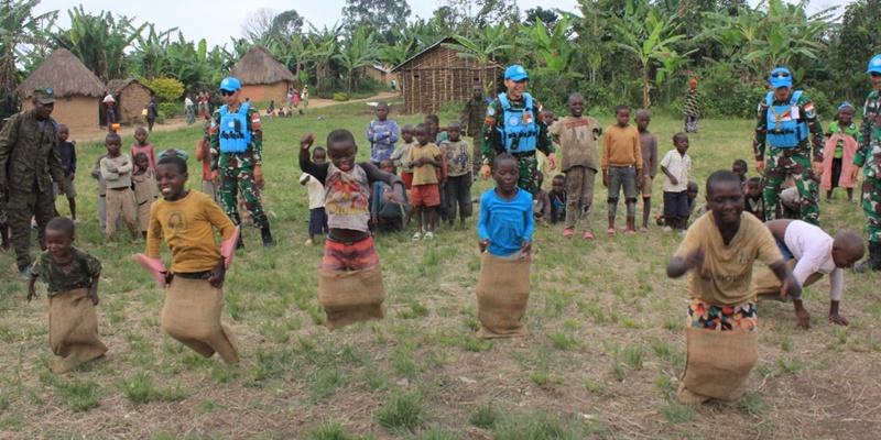 Sejumlah anak-anak di Desa Maliobongo, wilayah Tchabi, Republik Demokratik Kongo, terlihat antusias mengikuti lomba balap karung yang diselenggarakan Satgas TNI Kontingen Garuda (Konga) Rapid Deployment Battalion (RDB) XXXIX-G dalam rangka misi perdamaian. Balap karung merupakan permainan khas Indonesia yang kerap dipentaskan dalam momen perayaan HUT Kemerdekaan setiap tanggal 17 Agustus. (Foto: Puspen TNI)