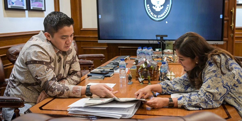 Sekretaris Kabinet Teddy Indra Wijaya melakukan perbincangan serius dengan Menteri Komunikasi dan Digital Meutya Hafid di Kantor Sekretariat Kabinet, Jumat malam, 27 Maret 2026. Pertemuan tersebut membahas implementasi Peraturan Pemerintah tentang Tata Kelola Penyelenggaraan Sistem Elektronik dalam Perlindungan Anak (PP Tunas) yang akan berlaku esok hari. (Foto: Setkab RI)