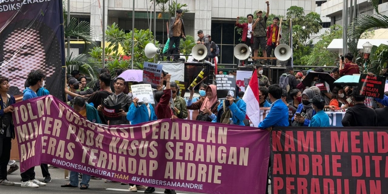 Ratusan mahasiswa bersama koalisi masyarakat sipil menggelar aksi demonstrasi sebagai bentuk solidaritas terhadap Wakil Koordinator KontraS, Andrie Yunus yang disiram air keras oleh oknum anggota BAIS TNI di Mahkamah Konstitusi (MK), Jakarta Pusat pada Rabu 8 April 2026. (Foto: Istimewa)