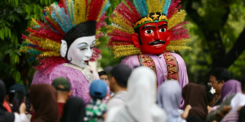 Lebaran Betawi ke-18 yang digelar di Taman Lapangan Banteng, Jakarta Pusat, pada Sabtu malam, 11 April 2026, diserbu ribuan pengunjung. Mereka datang untuk menikmati beragam hiburan, seni budaya, hingga kuliner khas Betawai yang disajikan dalam bazar UMKM. Suasana Lapangan Banteng semakin semarak dengan ornamen khas Betawi yang menghiasi area acara. (Foto: PPID DKI Jakarta)
