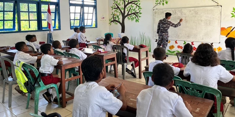 Personel TNI AL tengah mengajar siswa SD Marfenfen di Kepulauan Aru Selatan, Maluku. Sekolah ini sebelumnya sempat ditutup karena ketiadaan tenaga pendidik. Namun berkat dukungan Lanudal Aru, sekolah ini kembali dibuka sebagai sarana belajar mengajar di kepulauan terluar. (Foto: Dispenal).