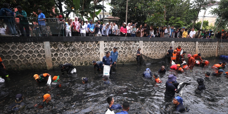 Pemprov DKI Jakarta gencar membasmi ikan sapu-sapu di sungai dan saluran. Dalam sehari, sebanyak 68.800 ikan sapu-sapu seberat 6,9 ton ditangkap di lima wilayah Jakarta untuk dimusnahkan. Wilayah dengan hasil tangkapan terbesar adalah Jakarta Selatan (Jaksel), yakni sebanyak 63.600 ekor dengan berat mencapai 5,3 ton. (Foto: PPID DKI Jakarta)