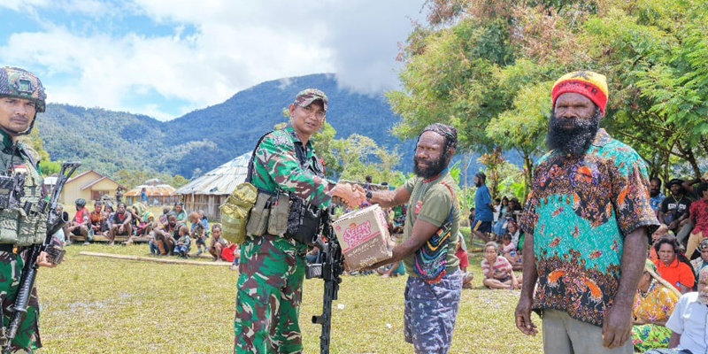 Komandan Distrik Militer (Dandim) 1714/Puncak Jaya, Letkol Inf Bagus Kurniawan didampingi personel Makodim melaksanakan peduli kemanusiaan dengan menyalurkan bantuan serta meninjau kondisi masyarakat pengungsi asal Distrik Sinak, Kabupaten Puncak, Papua Pegunungan, Minggu, 26 April 2026. Kedatangan Dandim dan rombongan disambut dengan antusias oleh Pdt. Yandinus Telenggen beserta seluruh masyarakat pengungsi dan warga setempat. (Foto: Puspen TNI)