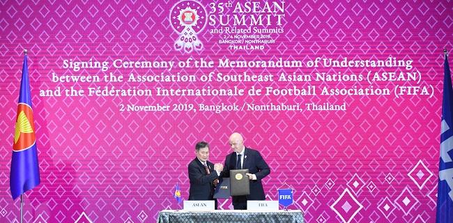 Memorandum Of Understanding (MoU) dengan Presiden FIFA Gianni Infantino di IMPACT Arena. Penandatanganan ini dilakukan di sela-sela Konferensi Tingkat Tinggi (KTT) ASEAN ke-35 di Bangkok, Sabtu (2/11).