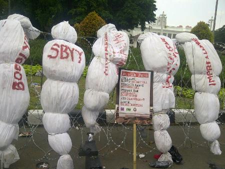 buah replika pocong yang ditulisi SBY, Boediono, Muhaimin, Jumhur