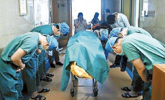 Tim dokter dan para medis yang menanganinya membungkuk memberikan hormat kepada jenazah Liang Yaoyi seorang anak berusia 11 tahun dari Guangdong, Republik Rakyat China. Yaoyi meninggal dunia karena kanker otak. Sebelum meninggal Yaoyi meminta agar organ tubuhnya yang masih terpakai didonasikan kepada siapapun yang membutuhkan. Foto di atas beredar di dunia maya dan kini menjadi salah satu foto yang paling banyak dilihat. CHINA DAILY