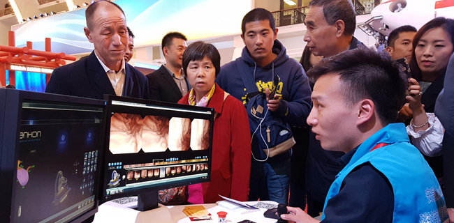 Seorang petugas memperlihatkan cara kerja kapsul robot yang dapat digunakan untuk mendeteksi bagian dalam sistem pencernaan tubuh manusia. Kapsul robot berukuran kecil itu dapat dikendalikan dari luar dan memberikan gambaran mengenai kondisi sistem pencernaan pasien. Kapsul robot ini ikut dipamerkan dalam rangkaian acara menyambut Kongres ke-19 Partai Komunis China di Beijing Expo, Beijing, Selasa (17/10).
